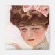 Vintage artwork of young pretty dark haired woman with pink bow holding a tea cup