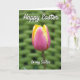 This greeting card features a close-up photo of a single tulip centered in the frame, like a small gift offered with sisterly affection 🌷. The outer petals are a deep fuchsia pink, shifting into lemon yellow on the inner folds and along the softly feathered edges. A slender, deep green stem rises from the bottom, grounding the flower while the bloom leans forward with a gentle, welcoming posture. Across the top, the words “Happy Easter” appear in white, flowing lettering that stands out against the green background. Near the bottom, “to my Sister” is placed in matching white lettering, spaced low and centered so it feels like a quiet note meant just for her 🐰. Behind the tulip, the background fades into a soft green blur that suggests a woven or lattice pattern without pulling attention away from the flower. Natural light gives the petals a tender glow, and the faint lattice texture sits softly in the background.