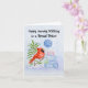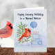 This hand-painted watercolor design features a bright red cardinal perched on a winter branch, holding a snowflake balloon and sitting beside a January birthday cake decorated with white and purple carnations—the traditional flowers for January.