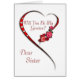 Invitation to Sister to be a greeter. A wonderful invitation for your wedding attendants.They will treasure this card forever. A modern take on a traditional theme shows a swirling heart with red roses. Copyright Norma Cornes.