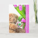 Teddy bear with pink tulip bouquet and polka dot border and lace for Sister's Birthday.