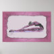 This is a stylzed drawing of a ballet dancer stretching over her legs. It has a rose pink border with black swirls.