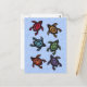 This postcard is light blue with six colourful turtles with abstract markings on their black shells in colours of blue, red, yellow, green, purple, and orange.