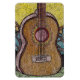 A reproduction of a surreal mixed media artwork adorns this unique looking magnet. The focal point is a guitar basking in the sun.