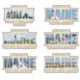 Six couture stickers of 5 different Maine lighthouses. They include Bear Island, West Quoddy, Duck Island (2), Egg Rock and Mark Island/Winter Harbour. Each sticker has an image of one of the lighthouses inside the word MAINE outlined in gold colour, Text above and below the images ar also gold colour. Availiable as a matt whie sticker or glossy transparent.