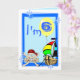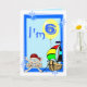 6th birthday card with funny pirate and ship, clown, penguin and balloons, on a blue background. Easily personalise this design by adding or changing the text.