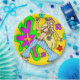 Totally retro sixties "flower child" wearing an animal print halter top and striped pants. She's barefoot and waving a peace sign. Behind are abstract flower shapes in various colours. Bright yellow, green, fuchsia, gold and turquoise