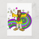 Sixties style hippie with his long hair, sandles, and dyed shirt. He has a beard and a head band and is holding both hand up to show the peace sign. Swirling colours are behind him and stars and other shapes swirl above.
