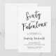 Sixty and Fabulous script minimal black and white modern 60th birthday invitation that you can personalize and send out for your sixtieth birthday party celebration. The words "Sixty and Fabulous" are set using popular script font typography.