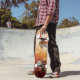 Skateboard design features a young man crouched over his skateboard. Background is streaking gears. Text says Toyz and SK8 People in smaller letters.
