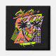 Abstract Memphis style "Skate or Die" text design with palm trees, skeleton on a surfboard, halftones and geometric shapes decoration