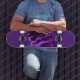 Skateboard shown in a multi purple colour abstract smoke graphic print.