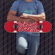 Skateboard shown in a solid colour of red with a artful black and white swirl graphic print. Buy as is or customise this item to your liking.