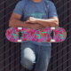 Skateboard shown in a hot pink multi colours tropical palms graphic print.