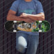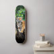 The skateboard features a design inspired by a powerful hunter, specifically a Bengal tiger. The skateboard has illustrations, graphics and colors depicting the image of a Bengal tiger, a majestic and fierce feline. The choice of this design evokes the strength, agility and beauty associated with tigers, providing a visually shocking and exciting look to the skateboard. This type of design would not only contribute to the aesthetic of the skateboard, but also arouses the imagination and interest of those who use it, adding a thematic and distinctive element to the object.