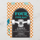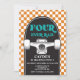 Four Ever Rad! Skateboard Let's Kick It, 4th Birthday invite with orange check and blue skateboard.