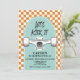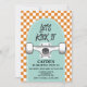 Skateboard Let's Kick It, Birthday invite with orange check and blue skateboard.