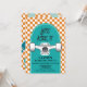 Skateboard Let's Kick It, Birthday invite with orange check and blue skateboard.