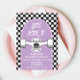 Skateboard Let's Kick It, Birthday invite with black check and purple skateboards.