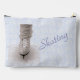 This pretty accessory bag features a well-worn figure skate, set against a background of snowflakes. Perfect for carrying all your makeup or hair accessories to practice!