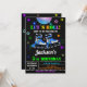 Rolling neon colours theme birthday invitation for a boy birthday featuring disco ball, pair of girly skates and some stars around.