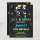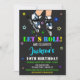 Rolling neon colours theme birthday invitation for a boy skater birthday featuring a pair of boyish skates and some stars around.