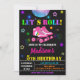 Rolling neon colours theme birthday invitation for a girl birthday featuring disco ball, pair of girly skates and some stars around.