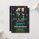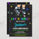 Rolling neon colours theme birthday invitation for a boy skater birthday featuring a pair of boyish skates and some stars around.