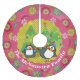 Beautiful Christmas holiday tree skirt features two adorable penguins in ice skates, striped scarves, and winter hats and three decorated Christmas trees on a background of hot pink with snowflake orbs, a ring of solid pink with white snowflakes, and a centre of mustard with little white polka dots. You can easily customise this festive holiday tree skirt with your family name!