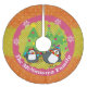 Beautiful Christmas holiday tree skirt features two adorable penguins in ice skates, striped scarves, and winter hats and three decorated Christmas trees on a background of orange and mustard with polka dots, a ring of solid pink with white snowflakes, and a centre of mustard with little white polka dots. You can easily customise this festive holiday tree skirt with your family name!