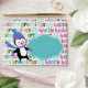 Our Skating Penguins Christmas holiday envelope perfectly matches our Skating Penguins holiday greeting card, postage stamps, return address labels, and stickers! The front features a white with blue snowflakes background with typography text that reads Happy Holidays and Season's Greetings, a cute penguin in winter hat and scarf ice skating, and a blue banner for personalising with addresses. The inside flap has another skating penguin, an ice skate, and pair of mittens with more typography text on the envelope back.