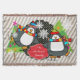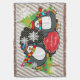 Our Skating Penguins personalised holiday throw blanket features two cute penguins wearing ice skates,winter hats, and scarves on a white and grey diagonal stripe background with little polka dots on black with snowflakes of white, two decorated Christmas trees, and a red banner you can easily personalise with a name!