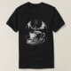 This black t-shirt features a black and white illustration of a skeleton sitting inside a steaming coffee cup on a saucer. Behind the cup is a large moon and a silhouetted forest. The design has a slightly surreal and macabre yet whimsical feel.
