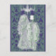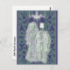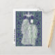 Elegantly dressed skeleton bride and groom ghosts walking down the isle. Above their heads hands a stylish chandelier. Background includes a teal and purple pattern. Fun postcard design is perfect for sending a Halloween note or invitation.