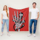 Skeleton hand blanket featuring a graphic illustration of a hand of a skeleton with black spooky ghosts with glowing eyes swirling around it over customisable deep red background.