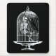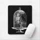 A collage of vintage images forms a gothic fantasy vignette of a tiny skeleton with wings and a princess crown seated inside a draped birdcage.