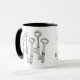 Coffee mugs featuring a hand-drawn, traditional style pen and ink drawing of a series of vintage antique skeleton keys. Skeleton key artwork is printed on both sides of the mug. Artwork: Pen and ink on paper. Copyright Dominic A. White.