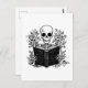 Skeleton reading book postcard for romance readers. Cute skeleton holding a book illustration. Black and white skeleton book flowers aesthetic stationery. Funny book lover gift idea. Gothic bookish postcard.