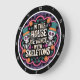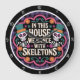 This whimsical round graphic features two stylised skeletons in teal top hats, holding flowers. The text, "IN THIS HOUSE WE DANCE WITH SKELETONS," is in the centre. The skeletons are set against a purple and black plaid background, with an ornate pink and teal border, creating a fun and festive Halloween or Day of the Dead decoration.