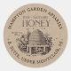Personalise with your business name, address, and honey weight. Central illustration of a vintage skep hive in a garden surrounded by bees. Ideal for beekeepers and honey sellers. Common honey net weight conversions: 8oz (227g), 12oz (340g), 16oz (454g), 32oz (907g), 5lb (2.27kg).