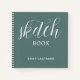 Sketch Book with your name notebook. White script and plain text on a green grey background.