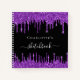 Black background. Purple faux glitter drips, paint dripping look. The title: sketchbook written with a girly modern hand lettered style script with swashes. White coloured letters. A notebook for drawings, sketching, notes and school homework.