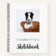An elegant white background. Personalise and add your own photo of your dog or pet. Add your name and a title. The title is written with a modern hand lettered style script. Black coloured letters. A notebook for sketching your dog, taking notes or for school homework.