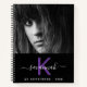 A chic black background. Personalise and add your own photo, a name, monogram letter and a year. The name is written in white with a large modern hand lettered style script with swashes. The monogram letter in purple. For school, work as a sketchbook, diary and journalling. To keep the swashes only delete the sample name, leave the spaces or emoji's in front and after the name