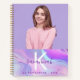 A pink, purple and blue holographic background. Personalise and add your own photo, a name, monogram letter and a text/year. The name is written in purple with a large modern hand lettered style script with swashes. The monogram letter in white For school, work as a sketchbook, diary and journalling. To keep the swashes only delete the sample name, leave the spaces or emoji's in front and after the name