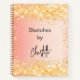 An orange and gold gradient background. Decorated with confetti. Personalise and add a name, The title: sketchbook written with a girly modern hand lettered style script, signature style. Black coloured letters. A notebook for drawings, sketching, notes and school homework.