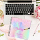 A trendy holographic coloured background with unicorn and rainbow pastel colours in pink, purple, rose gold, mint green. Decorated with faux glitter drips in rose gold, pink and purple. Personalise and add a name, The title: sketchbook written with a girly modern hand lettered style script with swashes and a brush. Pink coloured letters. A notebook for drawings, sketching, notes and school homework.