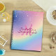 A trendy sparkling coloured notebook with mixed turquoise, pink and mauve and light yellow glitter with many little stars. You can personalise this notebook by adding your name and initial.