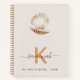 A beige background. Decorated with a watercolored sea shell, scallops with a pearl inside. Personalise and add a name, monogram letter and a year. The name is written in white with a large modern hand lettered style script with swashes. The monogram letter in grey. For school, work as a sketchbook, diary and journalling. To keep the swashes only delete the sample name, leave the spaces or emoji's in front and after the name