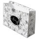 A beautiful pattern of hand drawn flower outlines in shades of grey on a white background. The striking gift bag shown here also features your name and/or other optional text in white on black. Search ID939 to see all the products in this design set.